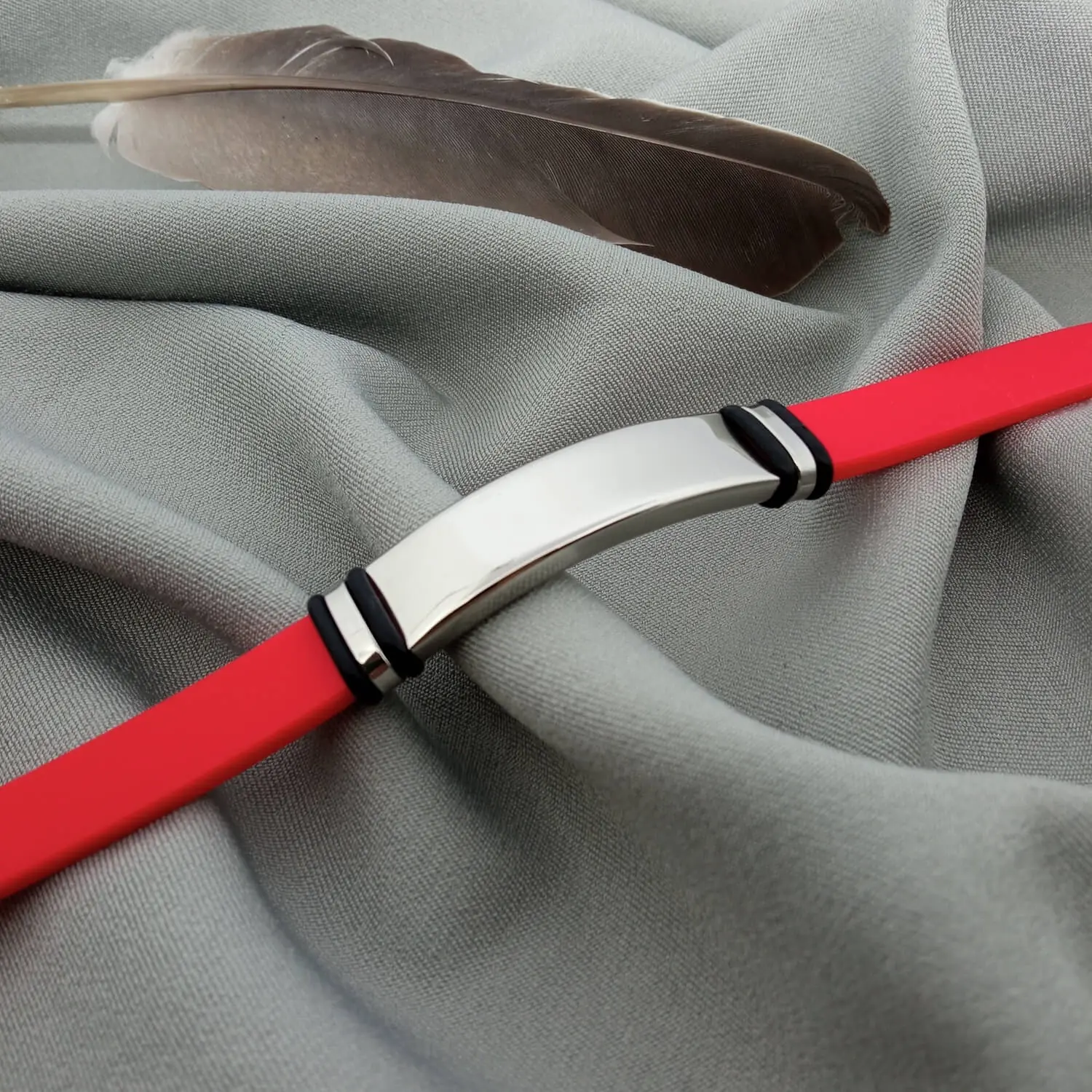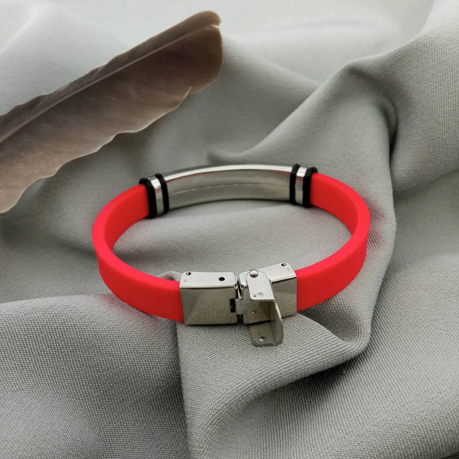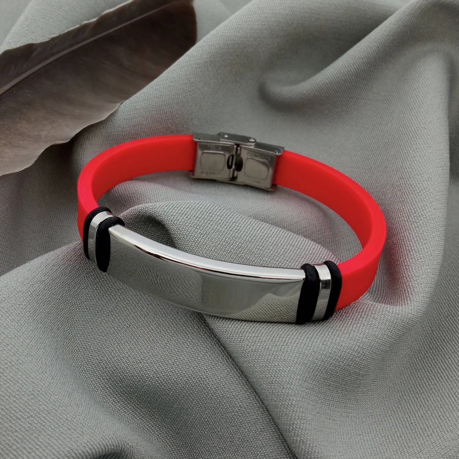 | *** | Браслет із гіпоалергенної гуми з табличкою з нержавної сталі. |